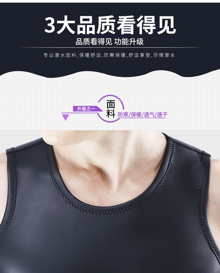 This vest is made of CR+super elastic material, with four needle six thread stitching and no zipper. 1.5mm and excellent elasticity