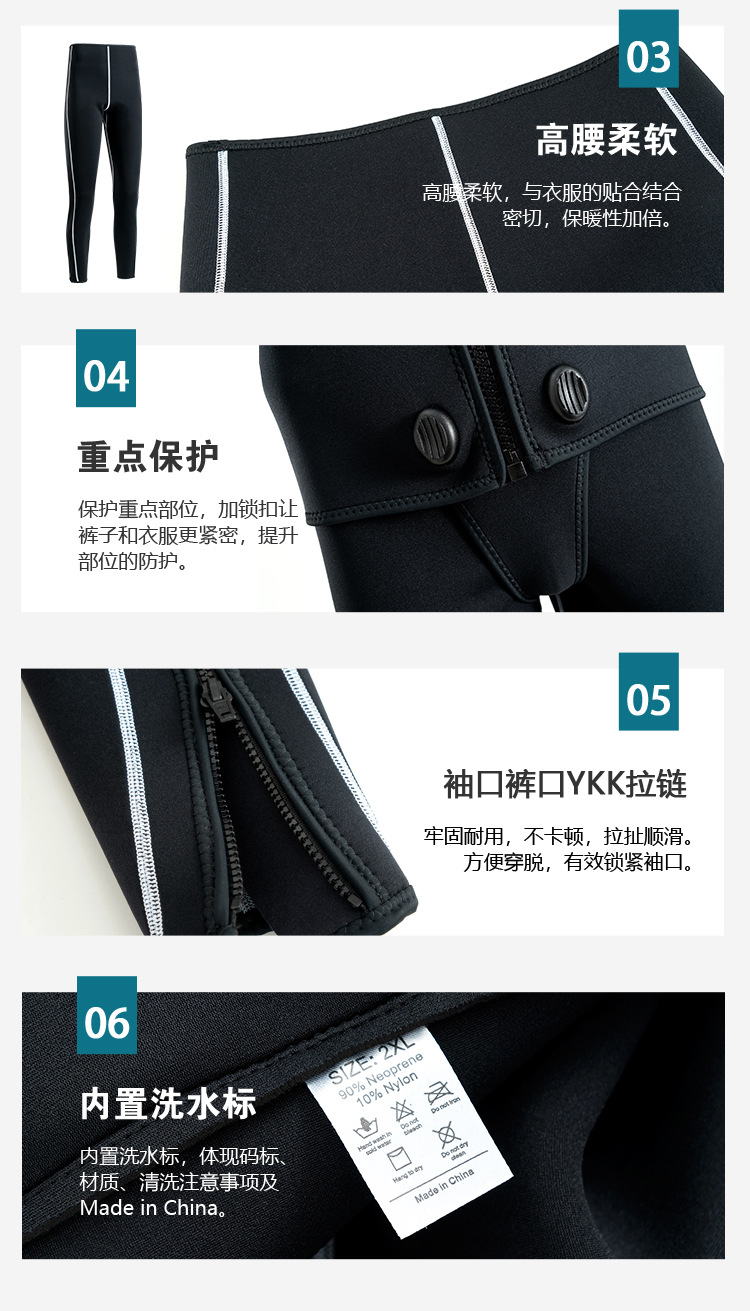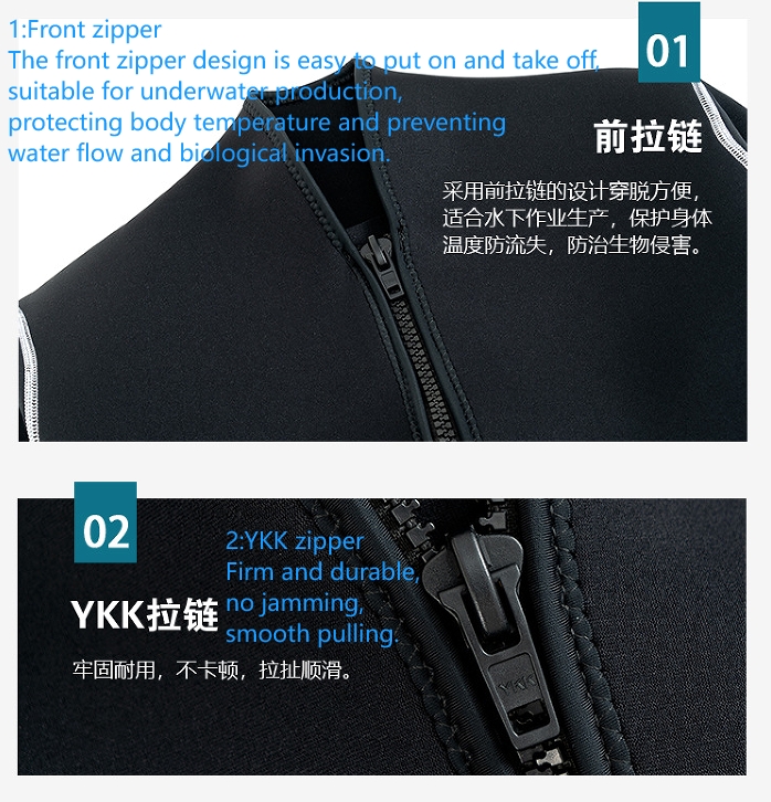 The front zipper design is easy to put on and take off, suitable for underwater production, protecting body temperature and preventing water flow and biological invasion.